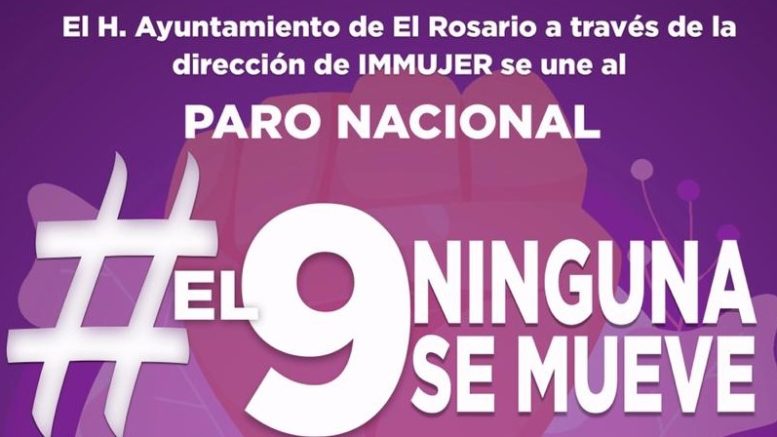 El Ayuntamiento de El Rosario se sumará a la campaña nacional que busca proteger a las mujeres, esto mediante un paro de labores para el próximo 9 de marzo, acción que tiene el objetivo de respaldar a quienes están haciendo acciones para alzar la voz en el tema de los feminicidios, así lo dio a conocer el presidente municipal, Dr. Manuel Antonio Pineda Domínguez.
