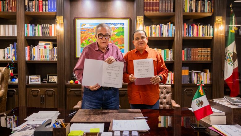 El gobernador Rubén Rocha Moya firmó con el secretario general de la Sección 53 del Sindicato Nacional de Trabajadores de la Educación (SNTE), Ricardo Madrid Uriarte, el acuerdo de Minuta Estatal 2025.